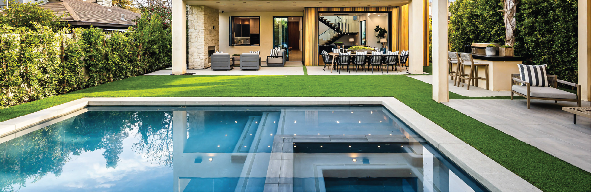 Les aménagements extérieurs liés : terrasses, plages, espaces bien-être, pool house, etc.