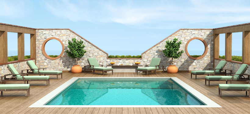 Les aménagements extérieurs liés : terrasses, plages, espaces bien-être, pool house, etc.